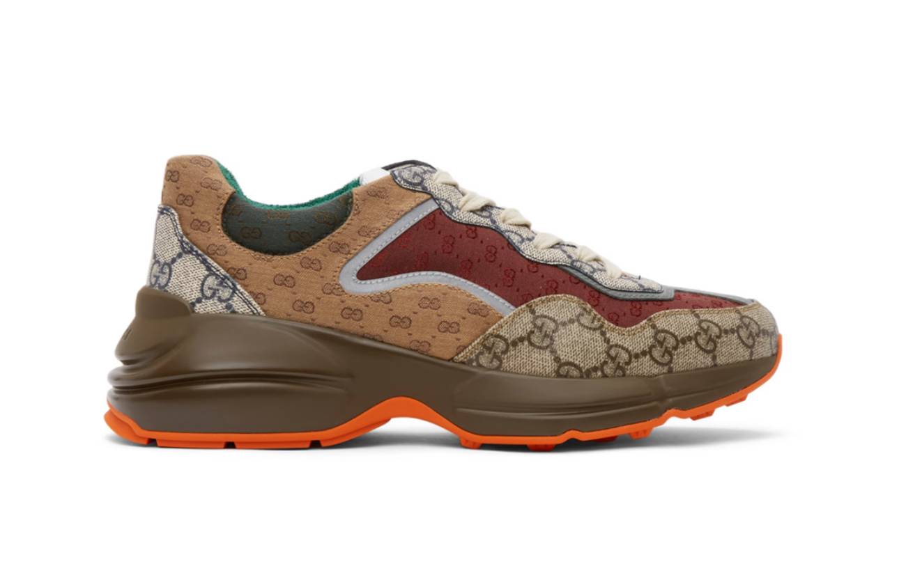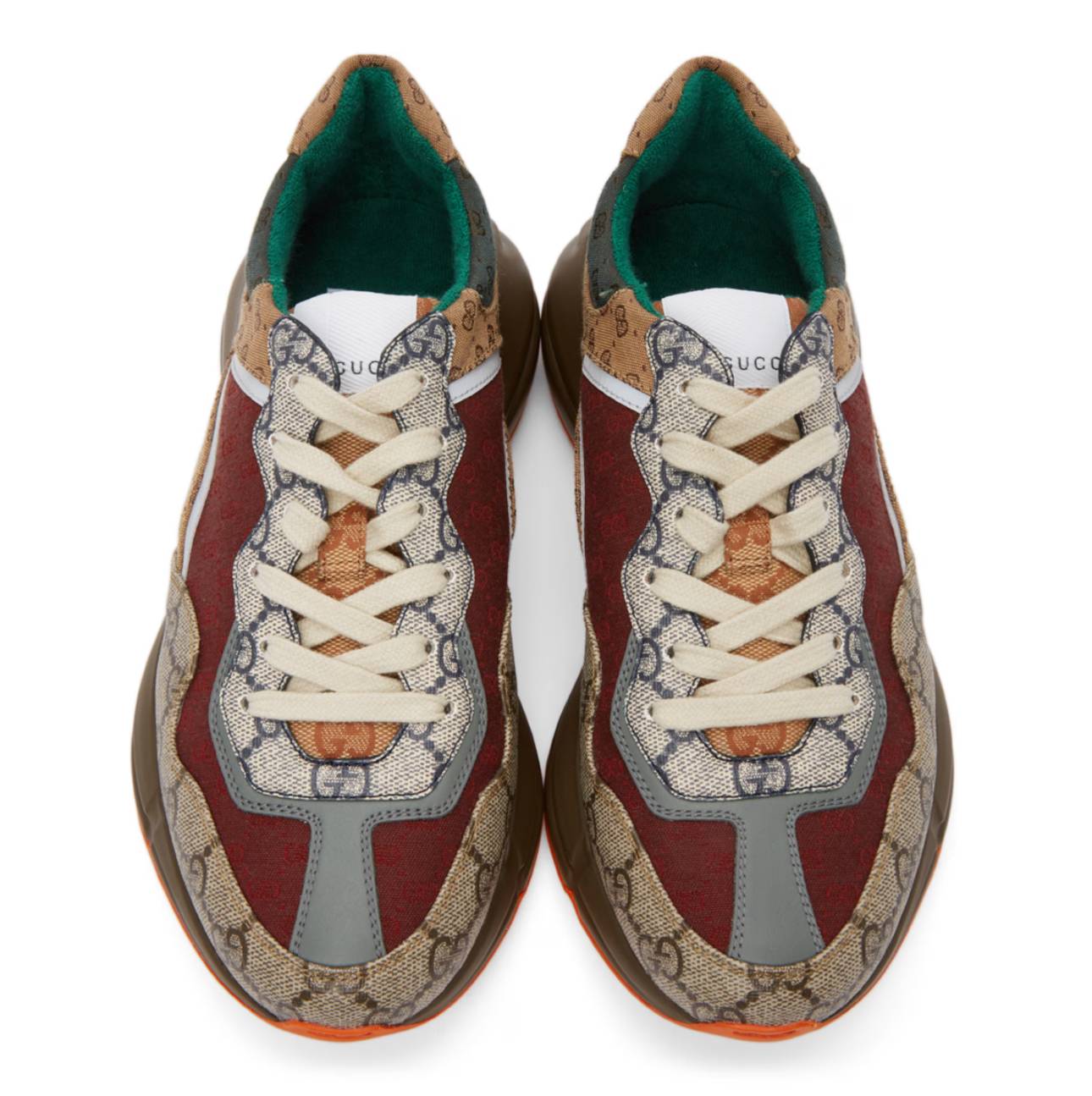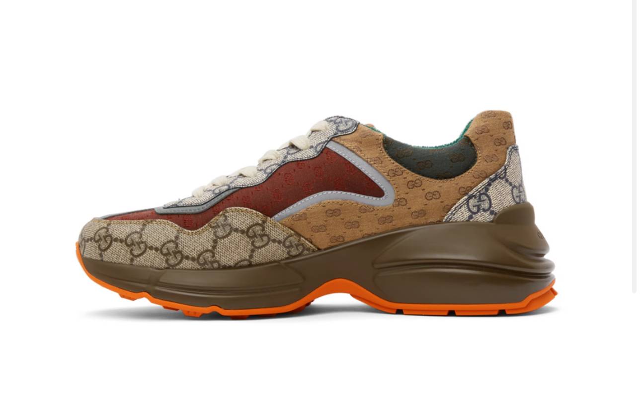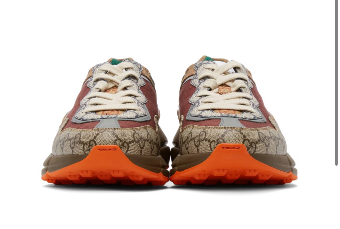 Gucci Rhyton Sneakers are a signature shoe design from the luxury fashion brand, Gucci. The brown version of these sneakers undergoes an elevated overhaul with the addition of the iconic GG Supreme canvas. The shoe features a patchworked construction made up of beige and brown panels, all adorned with jacquard iterations of the house’s monogram. Leather inserts and reflective trims add contrast to the design. These sneakers boast a striking appearance due to their rubber soles, which come equipped with fluorescent-orange treads.