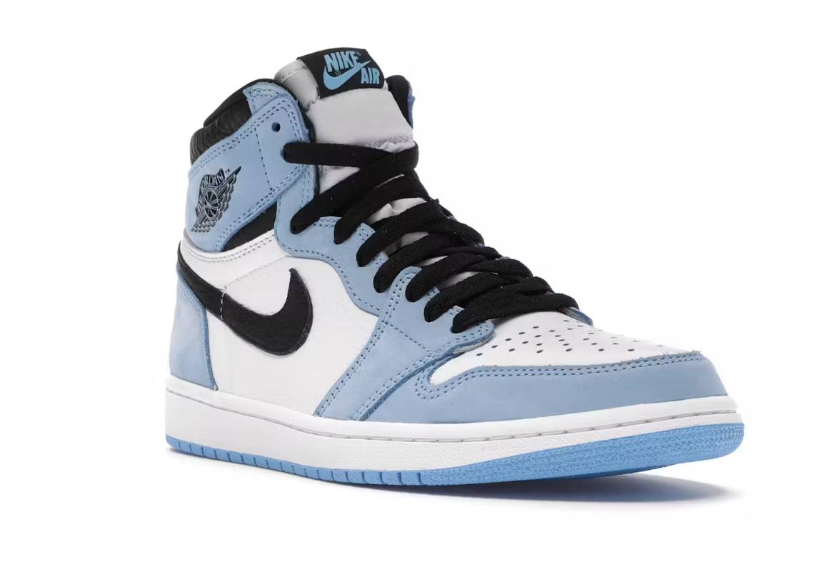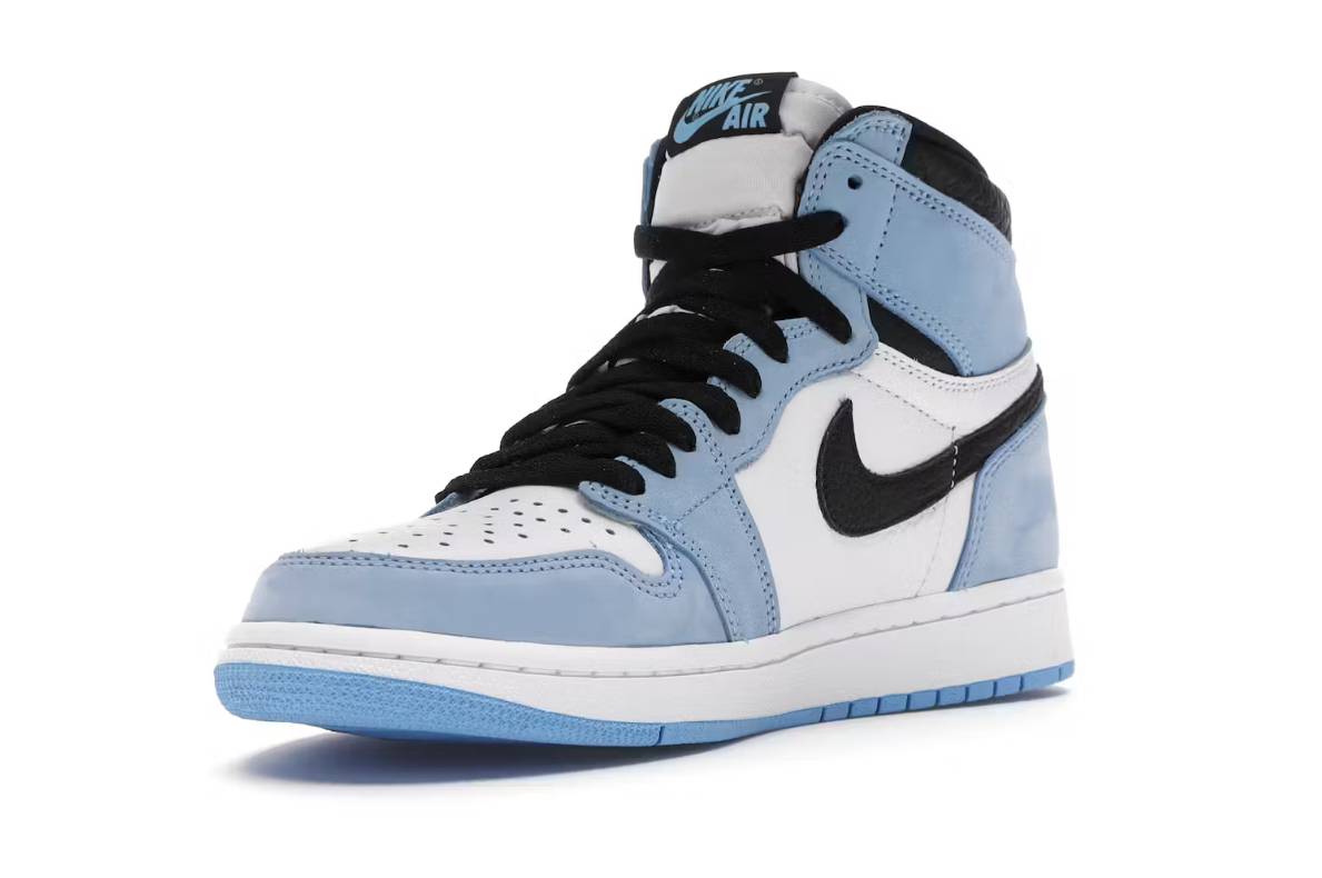 The Air Jordan 1 Retro High OG “University Blue” is a sneaker by Jordan Brand, honoring Michael Jordan’s alma mater, The University of North Carolina. It features a white, black, and “University Blue” leather upper, black overlays, and University Blue accents. The shoe also features Nike Air branding.